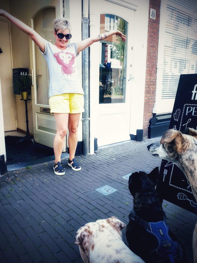 Zoetermeer is een klein stadje maar het was er gezellig druk en alle terrasjes zaten overvol. We hadden dus wel heel veel geluk toen we het laatste tafeltje veroverden op het terras van Woodstone. De bediening kwam onmiddellijk aangehold met bakjes water voor de honden, dus wij waren al gewonnen 🙂