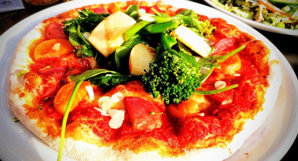 De kaart had 4 vegan opties. Heiko’s oog viel op de risotto funghi, een romige paddenstoelen risotto met verse paddenstoelen, doperwten, peterselie, rucola en walnoten. Ik ging voor de pizza bilancia volterra, een pizza waar ze het midden uit verwijderen en vullen met een lekkere salade van spinazie, appel en een rode ui-dressing, afgetopt met viooltjes en de pizza gegarneerd met geroosterde gele en rode bieten, bimi en geschaafde amandelen.