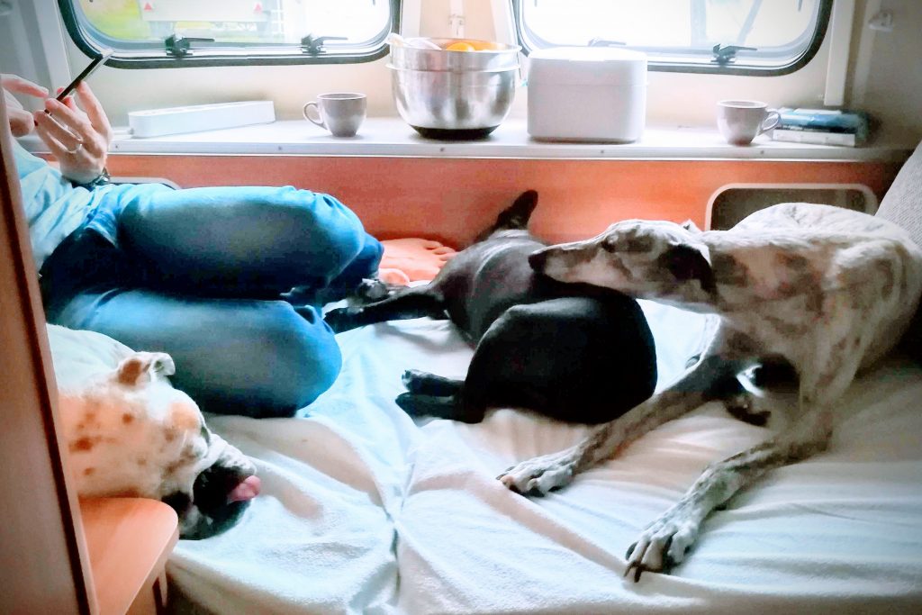 En zo werd het vrijdag. Het weer zat volledig tegen, stormachtig en veel regen. Dat werd opnieuw een dagje gezellig niets doen. We kropen allemaal samen op de bank en aten s avonds een lekkere ‘caravanmade’ pasta. Zorgeloos kamperen met 3 honden dus!