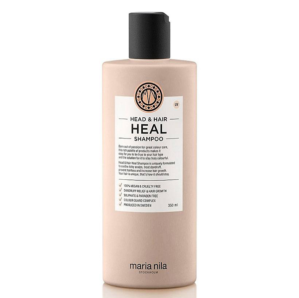 Maria Nila Head & Hair Heal shampoo werkt ontstekingsremmend en haargroei-stimulerend. Hij behandelt en voorkomt tevens roos, hoofdhuid-problemen en haaruitval.