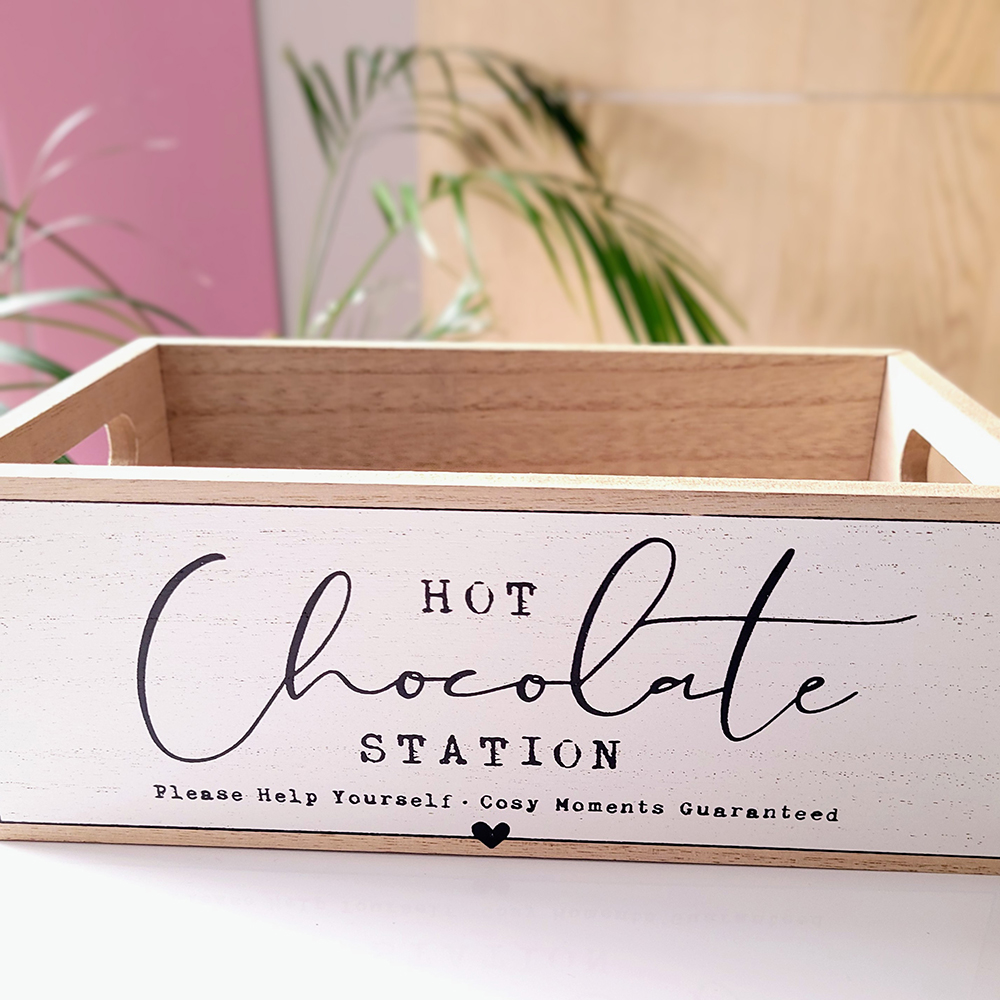 - Portland Living – hot chocolate station: een naturel, houten kratje. Het front is wit geschilderd met daarop de tekst “Hot Chocolate Station, Please help yourself – Cosy moments guaranteed”. Ideaal voor in de keuken om alle lekkers bij de hand te hebben – Afmetingen: 24 cm x 14 cm x 9 cm