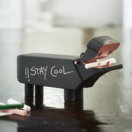 De Hippo Black van Kay Bojesen. Het glimlachende, zwarte nijlpaard van Kay Bojesen is een nieuwe kijk op het houten verzamelobject dat in 1955 werd ontworpen om het potlood van de ontwerper op zijn bureau te bewaken. De nieuwe aanwinst werd iets groter gemaakt en geverfd met schoolbordverf, zodat hij kan worden gebruikt voor het schrijven van notities en berichten. Wit krijt inbegrepen.