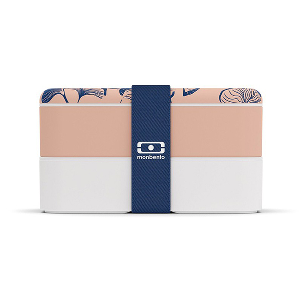 De monbento Original Ginkgo lunchbox levert men in een zachte roze-beige kleur met diepblauwe bladeren van de Ginkgo-boom, kenmerkend voor Japanse landschappen.