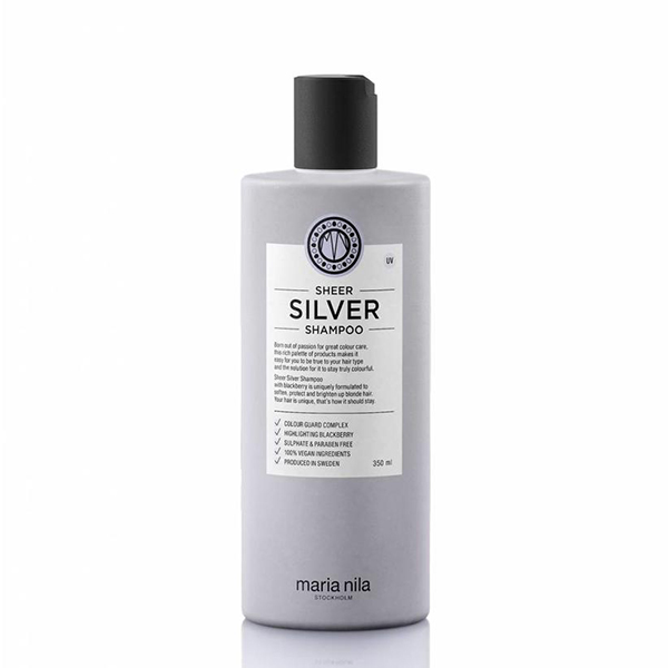 De natuurlijke, vegan zilvershampoo, Sheer Silver Shampoo van Maria Nila neutraliseert gouden tinten in blond, wit en grijs haar.