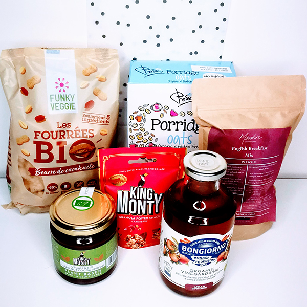 Funky Veggie glutenvrije met pindakaas gevulde ontbijtgranen, Rosies – Porridge Oats – bio glutenvrije havervlokken, Bongiorno – Organic Vinegardrink Apple & Cinnamon, King Monty – Granola Power Snack Cranberry, King Monty – Choco Hazelnut Cocoa Spread, Madn77 – English Breakfast thee, builtjes